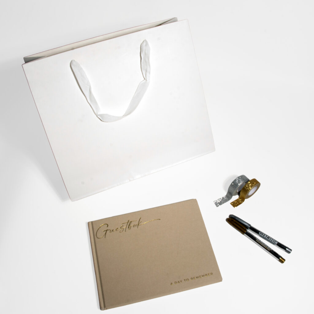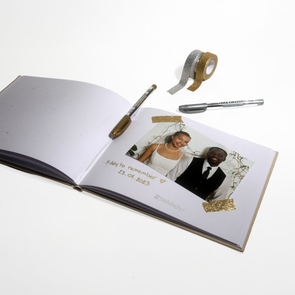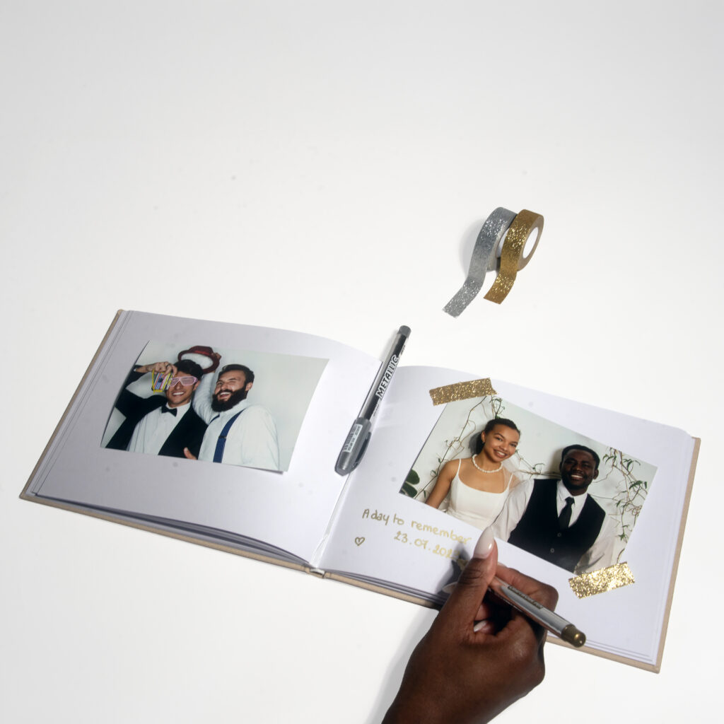 Vos invités prennent une photo avec la borne photo, l’impriment et l’ajoutent à votre livre d’or ! Ils peuvent aussi y laisser un message personnalisé. Chaque livre d’or est livré avec des stylos dorés et argentés, de la colle pour photos et des rubans adhésifs dorés et argentés pour le rendre encore plus spécial.